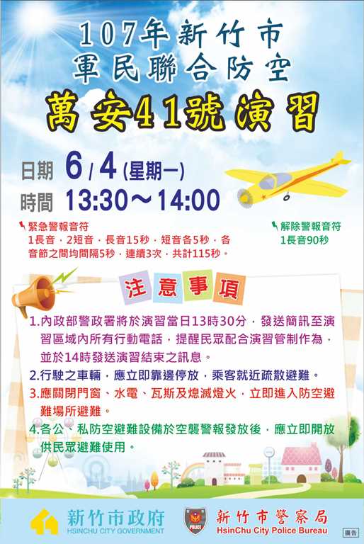 107年軍民聯合防空(萬安41號)演習 2018/06/01 107年軍民聯合防空(萬安41號)演習,將於6月4日(星期一)13時30分至14時,在北部地區(新竹縣、宜蘭縣、基隆市、臺北市、新北市、桃園市、新竹市)實施警報發放、人車疏散、避難及交通管制。